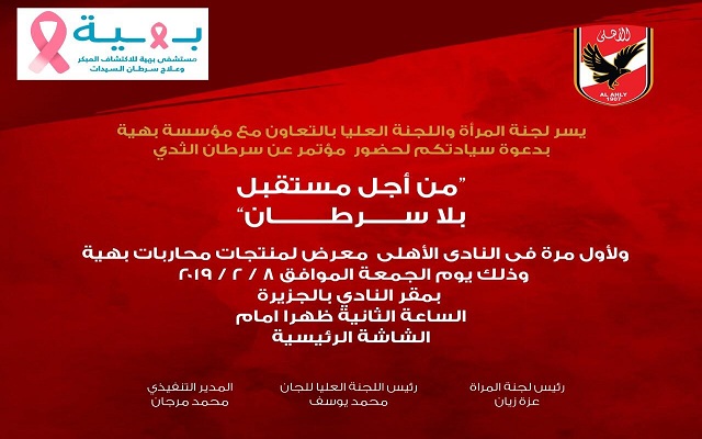 تنظم اللجنة العليا للجان بالنادي الأهلي برئاسة محمد يوسف، ولجنة المرأة برئاسة عزة زيان مؤتمرًا بالتعاون مع مؤسسة «بهية»؛ لمحاربة سرطان الثدي تحت عنوان «من أجل مستقبل بلا سرطان»، يوم الجمعة الموافق ٨ فبراير المقبل بمقر النادي الأهلي بالجزيرة، في الثانية ظهرًا أمام الشاشة الرئيسية.