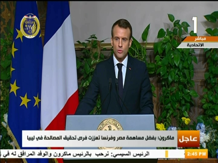 ماكرون: معالجة الوضع فى ليبيا التحدي الأساسى للاستقرار فى مصر وفرنسا ..فيديو