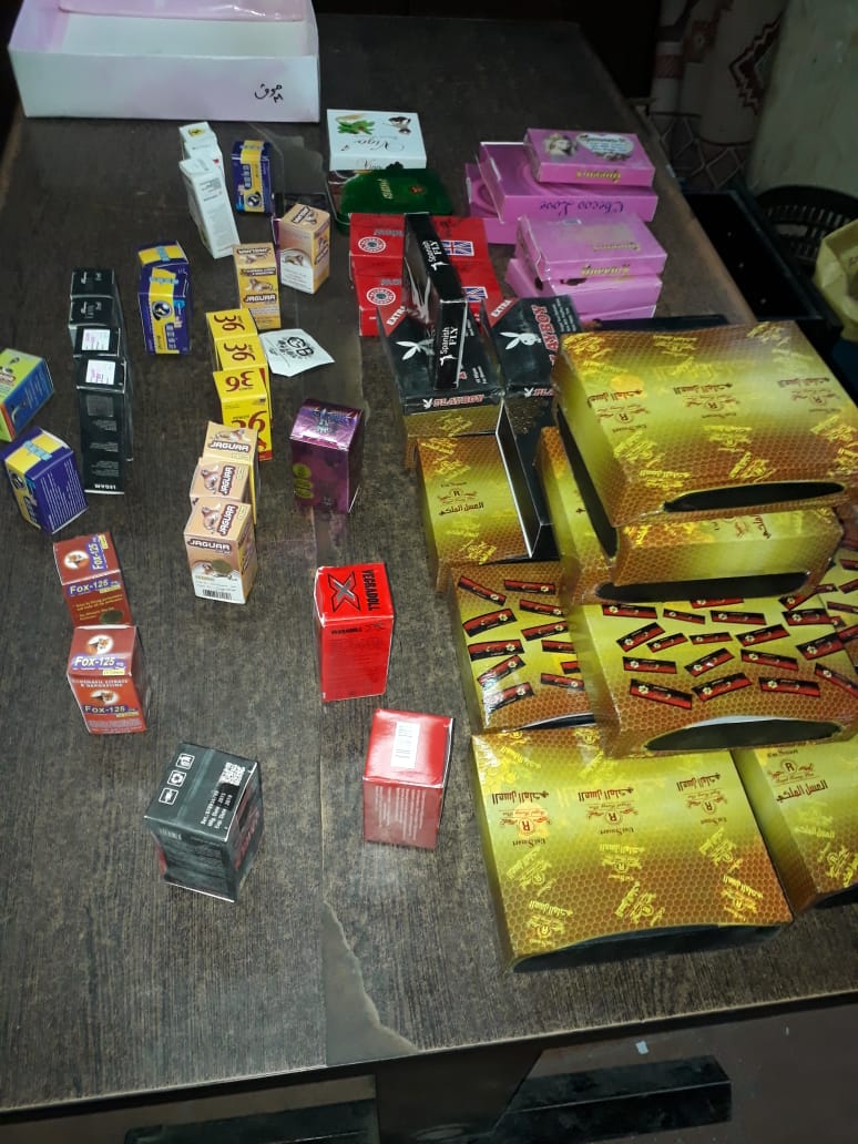 وبتفتيش المحل عثر على ٣٠ قطعة شيكولاته للسيدات، و٣٦ قطعة سيكسول شيكولاتة للسيدات، و٣٠ عبوة كوين اكس، و٥ اكياس كوفي ميكس للرجال سكس بور، و١٢ قطارة نقط تؤخذ بالعصائر للسيدات ريد ويد، و٩ عبوات دهان للتأخير الجنسي، و١٢٠ قرص منشط قوة الحصان، و١١٤ عبوة عسل جنسي للرجال، بلغ إجمالي المضبوطات ٣٥٦ عبوة منشطات جنسية بدون بيانات وغير صالحة للاستخدام الآدمي وغير مسجلة بوزارة الصحة كما جاء بلجنة التفتيش الصيدلي.