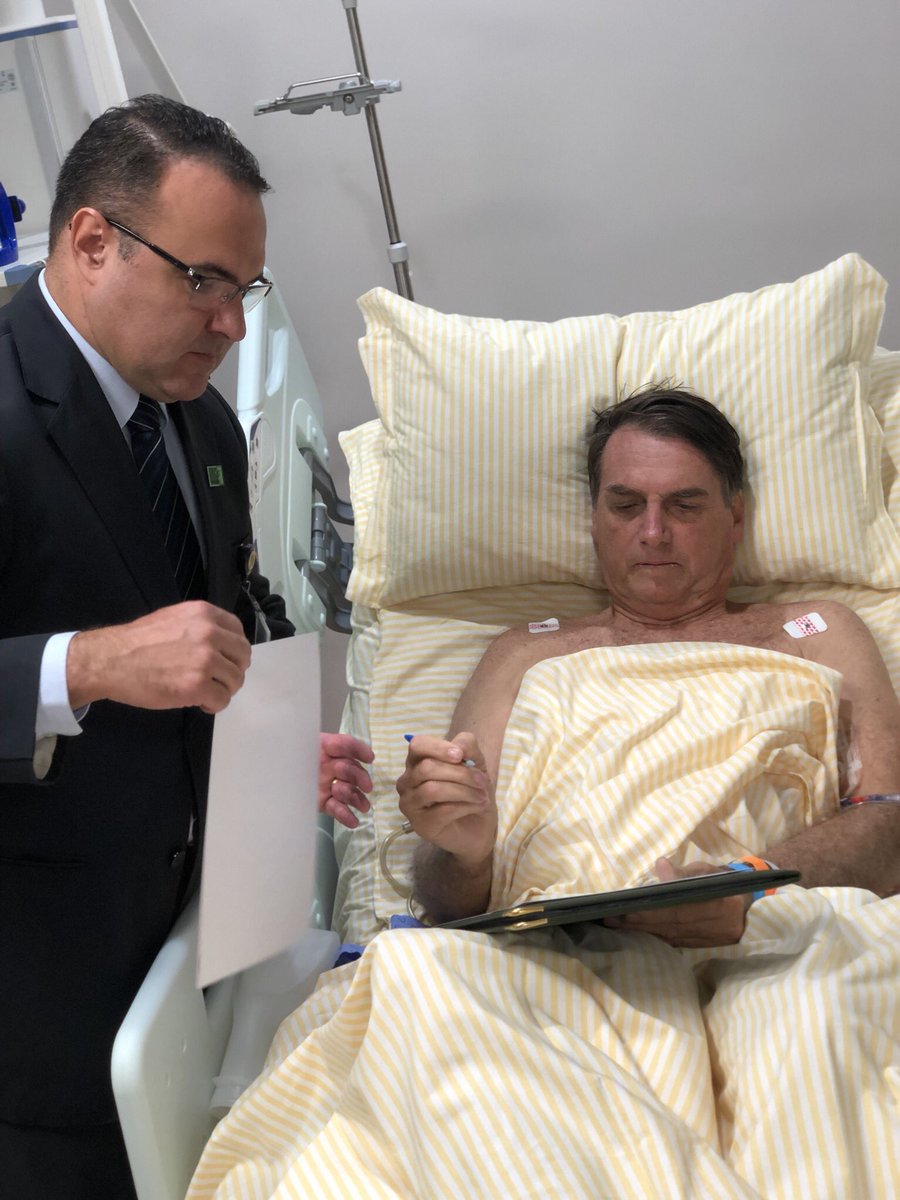 نشر الرئيس البرازيلي، جاير بولسونارو، اليوم الخميس، عبر حسابه الرسمي بموقع التواصل الاجتماعي "تويتر" صور أثناء رقوده في سرير إحدى المستشفيات، وهو يوقع على بعض الأوراق الخاصة بإدارة شؤون البلاد.