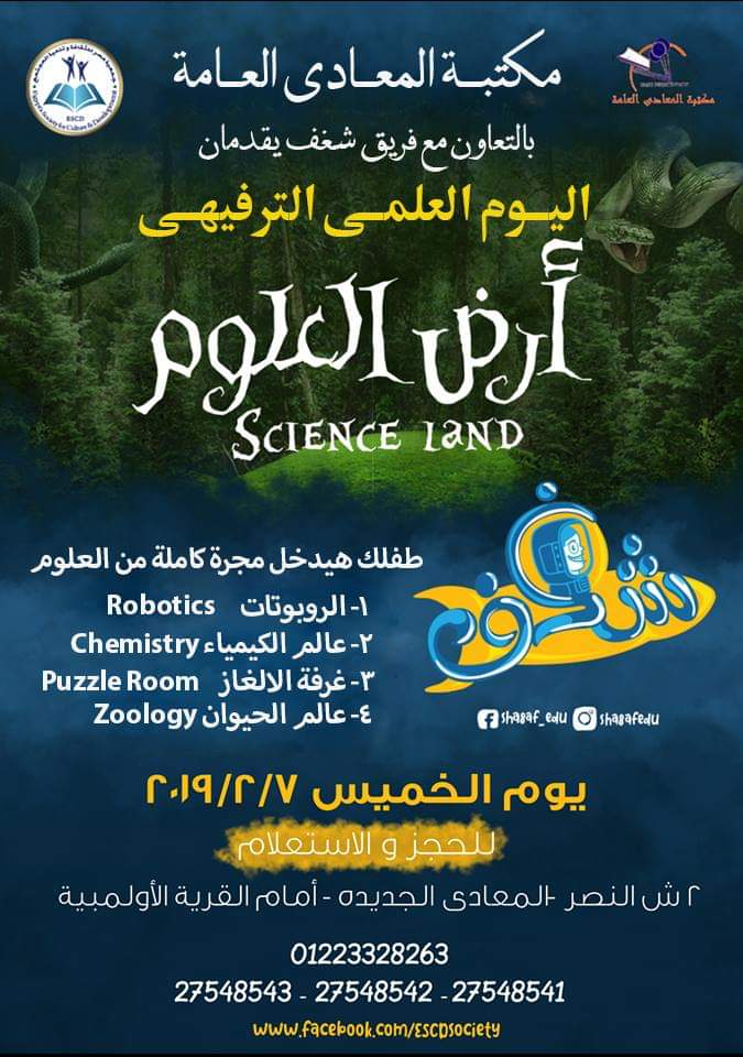تقيم مكتبة المعادي العامة غدا الخميس يوما علميا ترفيهيا تحت عنوان "أرض العلوم" وذلك فى إطار دورها الثقافى والتعليمى .