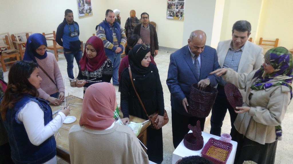 تفقد الدكتور مصطفى عبد النبي عبد الرحمن رئيس جامعة المنيا، والدكتور محمد جلال حسن، نائب رئيس الجامعة لشئون خدمة المجتمع وتنمية البيئة نتاج أعمال الطلاب المتدربين بمركز الحرف والصناعات الصغيرة والمتناهية الصغر من الطلاب بكليات السياحة والفنادق والتربية النوعية، والتربية للطفولة المبكرة بجامعة المنيا، والتي أثمرت عن إنتاج شنط مزينة بأعمال التوشية بالخرز، وعرائس الكروشيه، وأعمال فنية لمجسمات وأواني من خامة ورق الجرائد المعاد تدويره وسعف النخيل "العرجون".