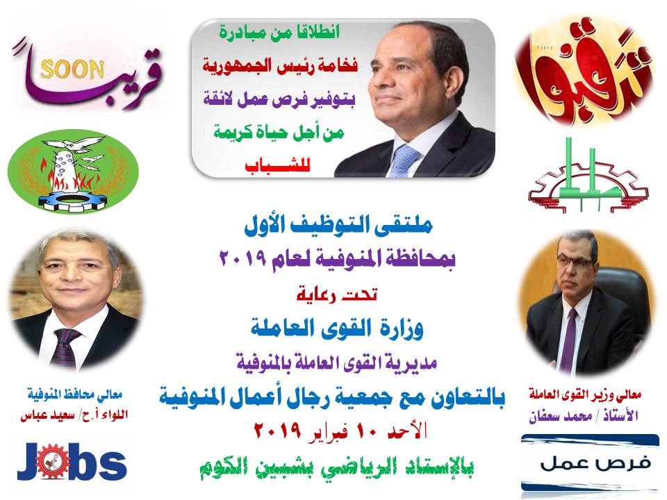يزور غدا محمد سعفان وزير القوي العاملة، محافظة المنوفية لافتتاح ملتقىالتوظيف بالاستاد الرياضي بمدينة شبين الكوم.