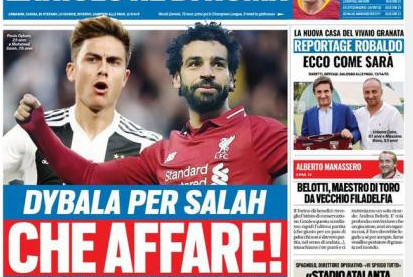 وتصدر الدولى المصرى محمد صلاح جناح ليفربول الإنجليزي، غلاف صحيفة "توتو سبورت" الإيطالية المقربة من نادى يوفنتوس بجوار النجم الأرجنتينى باولو ديبالا تحت عنوان: "صفقة تبادلية بين اليوفى و الريدز".
