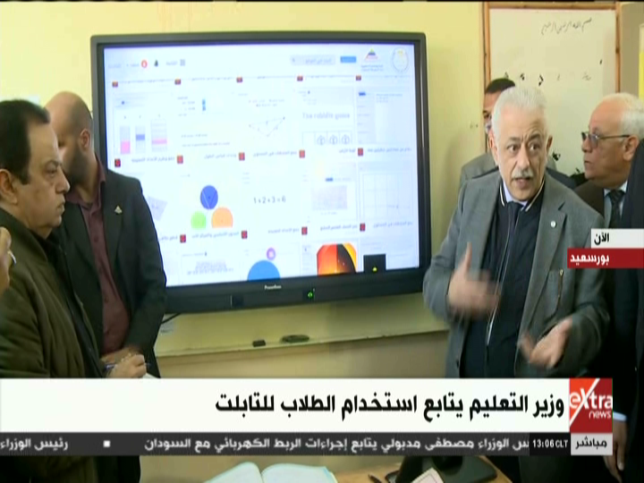 عرضت فضائية " إكسترا نيوز"، صباح اليوم، الثلاثاء، لقطات من تفقد الدكتور طارق شوقى وزير التربية والتعليم مدارس محافظة بورسعيد، وذلك لمتابعة استخدام الطلاب للتابلت.