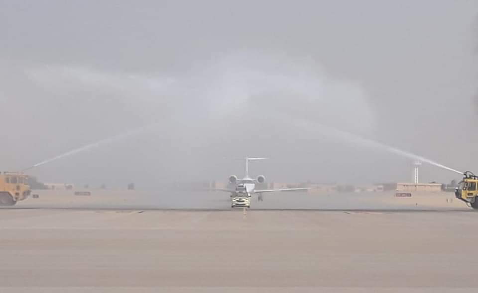 وقامت إدارة المطار، برش جسم الطائرة بالمياه وهو تقليد متبع للترحيب وحفاوة الاستقبال بالرحلات الجديدة للمطارات، كما قام فريق من العلاقات العامة باستقبال الركاب وتقديم الورود لهم.