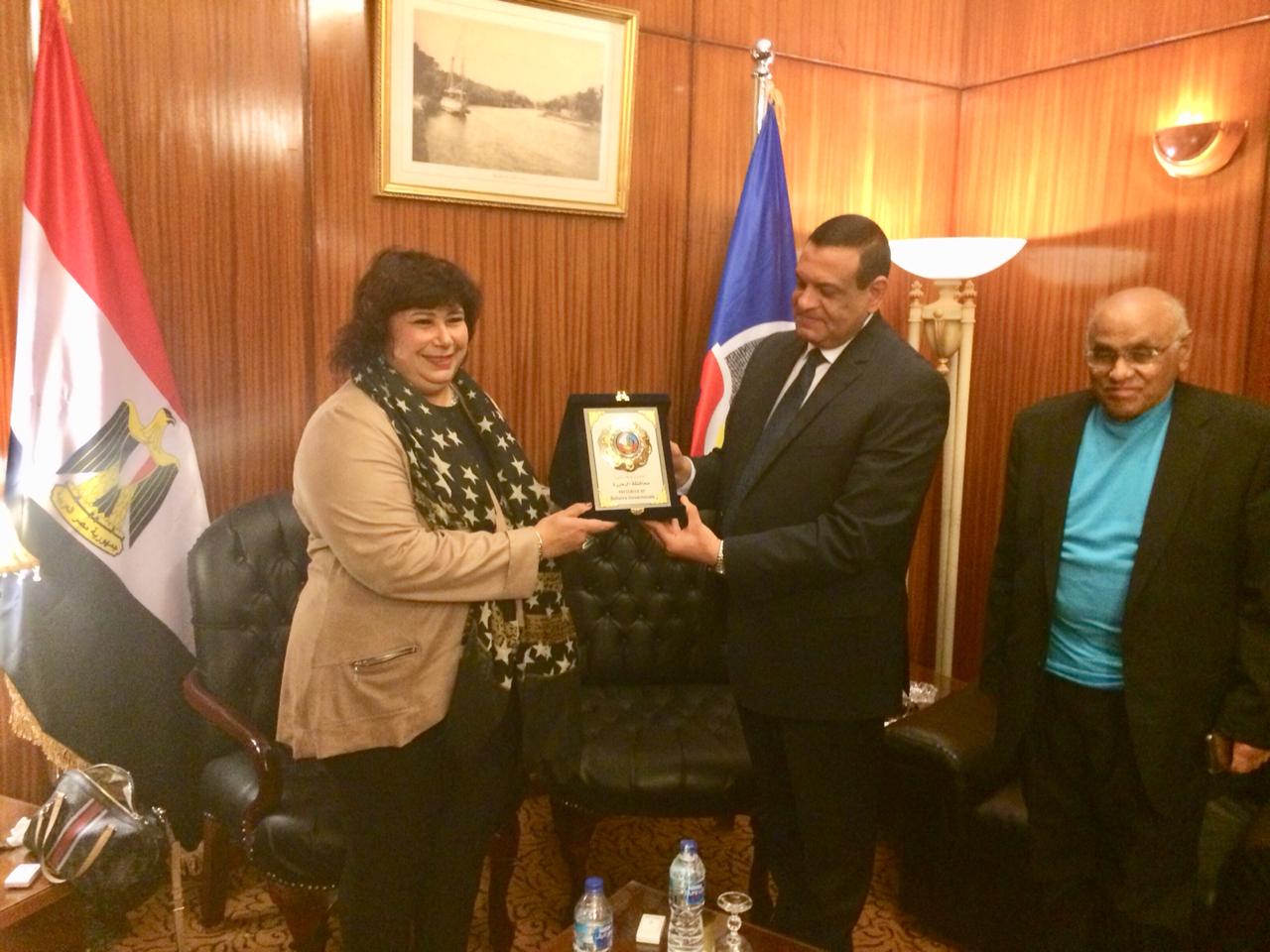 وأهدى محافظ البحيرة درع المحافظة للدكتورة إيناس عبد الدايم وزيرة الثقافة تقديرا للاسهامات الثقافية التي تقدمها للأهالي وابناء محافظة البحيرة.