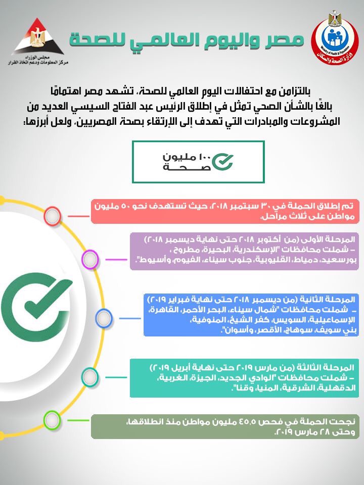 نشر مركز معلومات ودعم اتخاذ القرار، "إنفوجراف" حول اليوم العالمي للصحة، لافتًا إلى أن منظمة الصحة العالمية تحتفل باليوم العالمي للصحة في 7 أبريل من كل عام، كما أن المنظمة اختارت شعار التغطية الصحية الشاملة للاحتفال هذا العام.