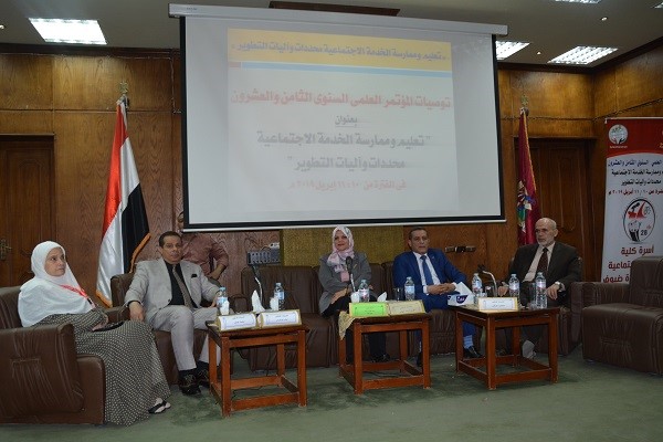 وإعادة النظر فى منهاج عمل الأخصائيين الاجتماعيين فى مجالات الممارسة المهنية المختلفة , الاهتمام باستخدام الأساليب التكنولوجية الحديثة فى تحقيق جودة الممارسة المهنية فى مجالات الخدمة الاجتماعية , مراجعة قوانين الضمان الاجتماعى واقتراح تعديلها وتغييرها وفقا ً للمتغيرات المجتمعية المعاصرة , ضرورة توثيق الممارسات والتجارب المهنية على مستوى وحدات العمل المختلفة كإطار مرجعى لتطوير البناء المعرفى والممارسين فى الخدمة الاجتماعية , ضرورة وضع آليات إجرائية لتسويق بحوث الخدمة الاجتماعية وذلك من خلال عقد شراكات مجتمعية مع جهات حكومية وأهلية , وأخيرا ً تشكيل لجنة لمتابعة توصيات المؤتمر يعهد إليها بالدراسة المتأنية للمؤتمر وما ناقشه من أوراق عمل وبحوث وإبراز ما يمكن الاستفادة منه وتطبيقه عمليا ً.