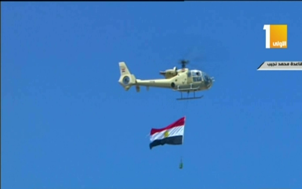 حلقت 5 طائرات هليكوبتر جازيل، حاملة علم القوات المسلحة، وأعلام الأفرع الرئيسية للقوات المسلحة، وذلك خلال استعراض أمام الرئيس عبد الفتاح السيسى بقاعدة محمد نجيب العسكرية.
