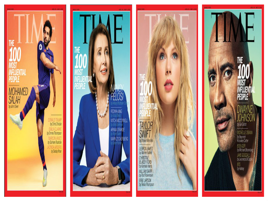 كشفت مجلة التايم الأمريكية عن قائمة الـ 100شخص الأكثر تأثيرًا فى العالم، والتى تصدرها كل عام فى هذا التوقيت، حيث يقع الاختيار على مجموعة من الأفراد بين فئات مختلفة، وفى هذا العام كانت 4 فئات، كبيرة، ولكن لم تصنف بأي شكل من الأشكال. لكن قائمة عام 2019 وتضمنت أربع فئات وهي:القادة، الفنانين، الرواد، والأيقونات.