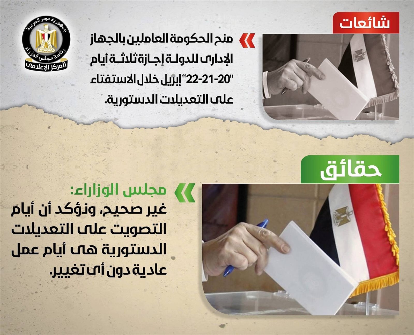 نفى المركز الإعلامي لمجلس الوزراء ما تردد في بعض المواقع الإلكترونية وصفحات التواصل الاجتماعي من أنباء تُفيد بمنح الحكومة العاملين بالجهاز الإداري للدولة إجازة 3 أيام للاستفتاء على التعديلات الدستورية، وذلك أيام (20-21-22) أبريل الحالي.