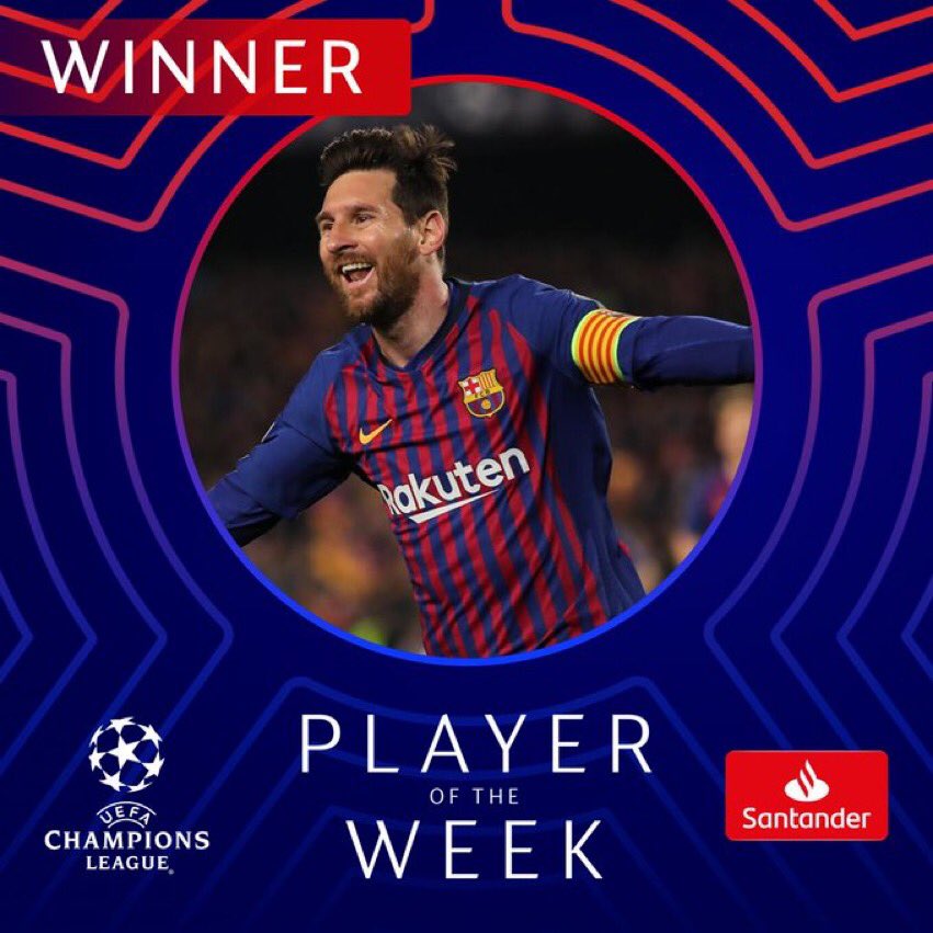 أعلن الإتحاد الأوروبي لكرة القدم عن فوز الأرجنتيني ليونيل ميسي قائد فريق برشلونة بجائزة أفضل لاعب في الأسبوع لدوري أبطال أوروبا.