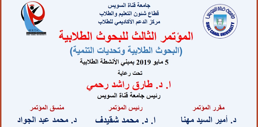 ينظم مركز الدعم الأكاديمي بجامعة قناة السويس المؤتمر الثالث للبحوث الطلابية تحت عنوان "البحوث الطلابية وتحديات التنمية، الأحد ٥ مايو، بمبنى الأنشطة الطلابية.