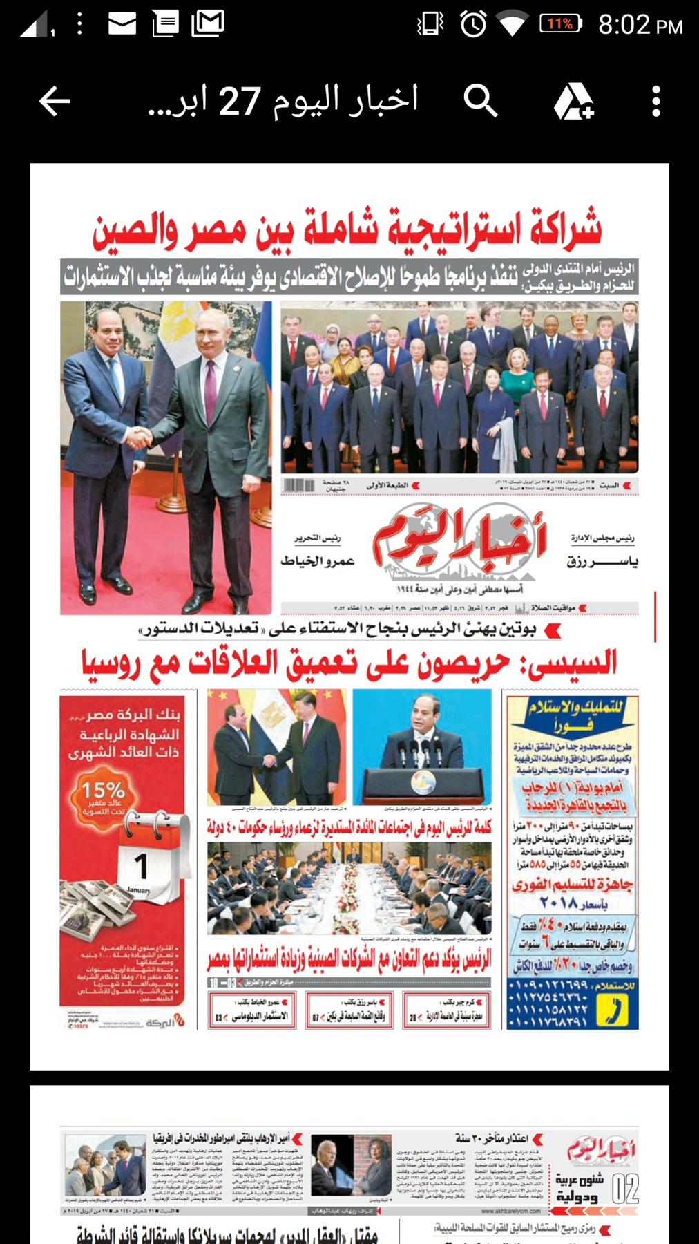 وجاءت أبرز العناوين التي تناولتها الجريدة كالتالي: شراكة استراتيجية شاملة بين مصر والصين، الرئيس أمام المنتدى الدولي للحزام والطريق ببكين :ننفذ برنامجا طموحا للاصلاح الاقتصادي يوفر بيئة مناسبة لجذب الاستثمارات.