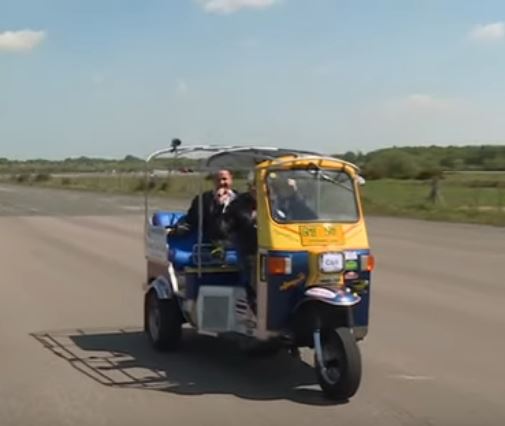 عرضت فضائية "روسيا اليوم" لقطات عربة "توك توك" بريطانية، الأسرع في العالم، بعد دخولها موسوعة جينيس، حيث حطم رجل الأعمال البريطاني مات إيفرارد رقما قياسيا عالميا في قيادة عربة التوك توك.