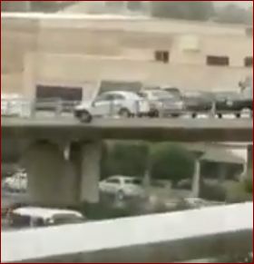 تداول رواد التواصل الاجتماعي مقطع فيديو عبر موقع التواصل الإجتماعي تويتر، لسيارة اخترقت الحواجز الحديدية أعلى أحد كباري الرياض وأوشكت على الانزلاق.