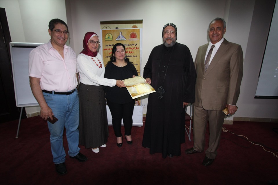 وسلم نيافة الأنبا إرميا الأسقف العام رئيس المركز الثقافي القبطي الأرثوذكسي في ختام ورشة العمل الشهادات للمشاركين بحضور الدكتورة نهى سالم مدير مركز الدراسات البردية والنقوش التابع لجامعة عين شمس والدكتور طارق منصور وكيل كلية الاداب بجامعة عين شمس، والدكتور عادل إبراهيم استشاري الجراحة ومستشار التعليم العالي بالمركز.