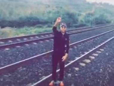 ظهر الشاب على قضبان السكة الحديدية وهى يغنى غير مبال بالقطار القادم أمامه بسرعة كبيرة، وفى آخر لحظة ابتعد عن مقدمة القطار، الذى كادت تفتك به.