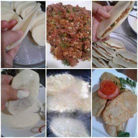 ٦)تقلى البطاطس المبطنة في زيت حار على حراره متوسطه وعندما تصبح ذهبية اللون ترفع على ورق ماص الزيت