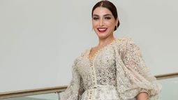 وظهرت روجينا بإطلالة جذابة بارتدائها الفستان الأبيض المنسدل على الأرض بختام مهرجان الإذاعة التونسية لتكريمها.