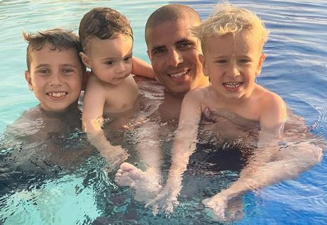 وظهر محمد زيدان فى الصورة برفقة أولاده الثلاثة داخل حمام السباحة.