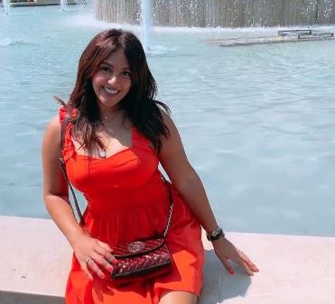 وظهرت نرمين ماهر فى مقطع الفيديو وهي تسير أمام حمام السباحة بفستان كت اورنج، شعرها المنسدل على الأكتاف.