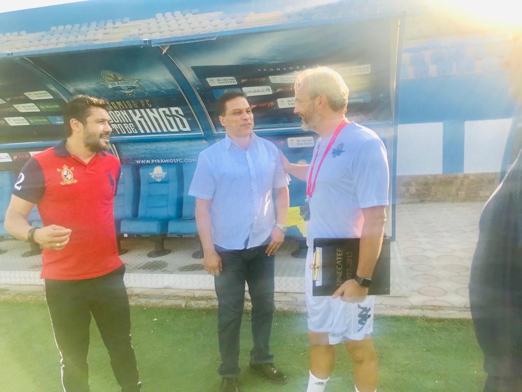 رحب الكابتن حسام البدري رئيس إدارة الكرة بنادي بيراميدز بالفرنسي سباستيان ديسابر المدير الفني للفريق على هامش المران المسائي على الملعب الفرعي لاستاد الدفاع الجوي.