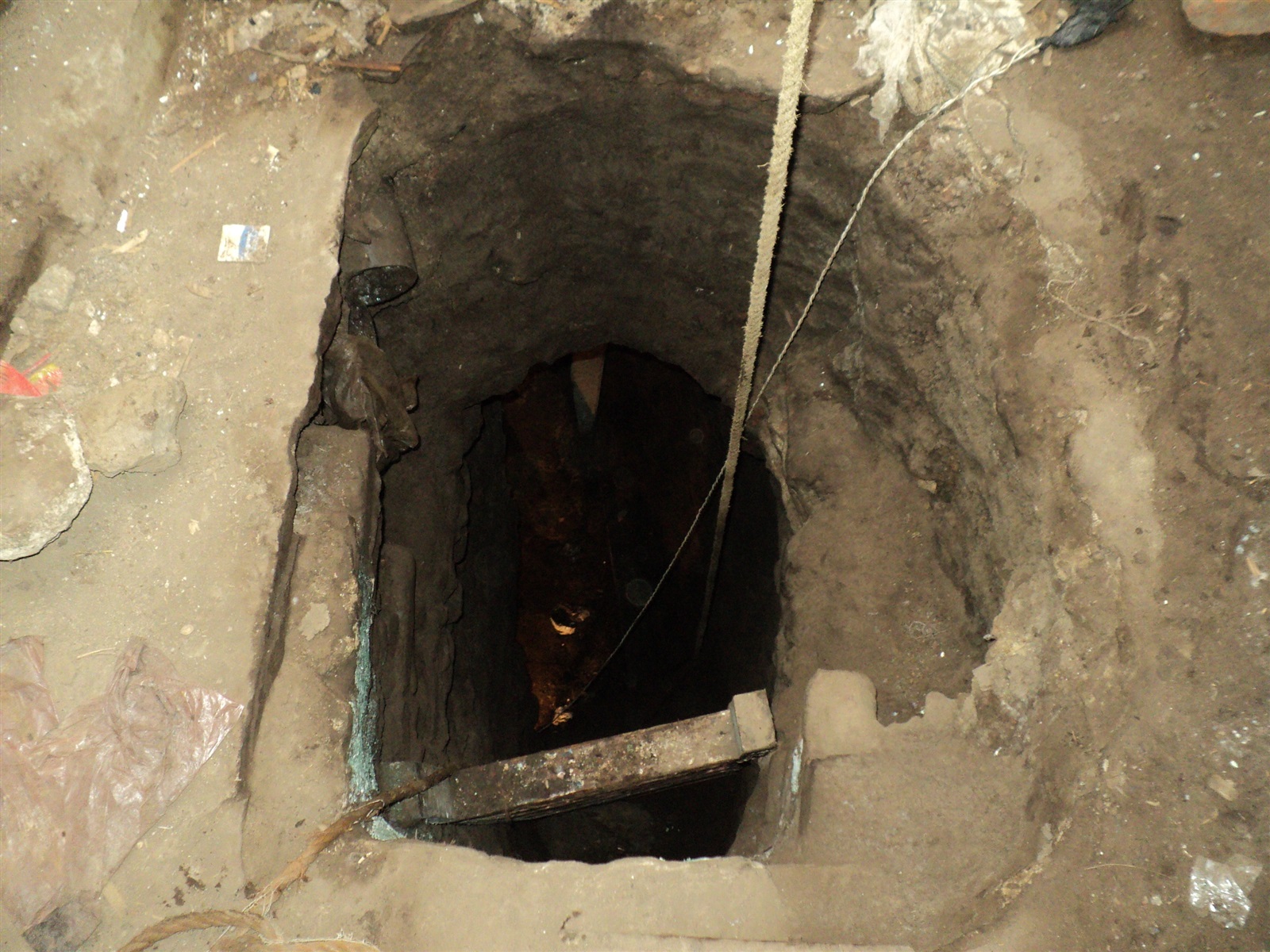 بالمعاينة تبين وجود حفرة قطر 1.5 متر وبعمق 5 أمتار صالة الطابق الأرضي حيث تم ضبط أدوات الحفر وتم التحفظ عليها.