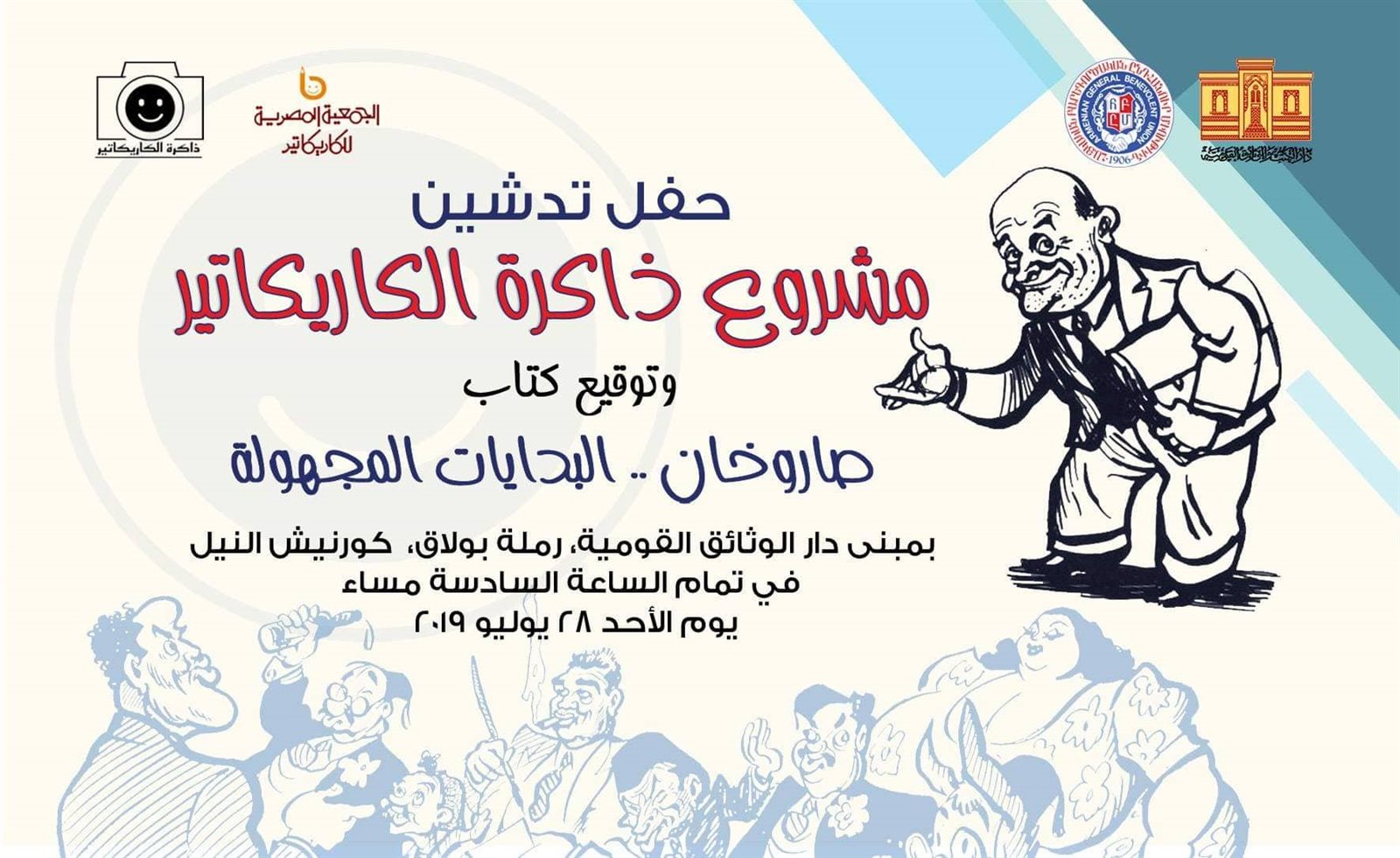 تدشن دار الكتب والوثائق، في السادسة مساء الأحد 28 يوليو، بقاعة الندوات بمبنى الدار مشروع: ذاكرة الكاريكاتير، ويتم توقيع كتاب: صاروخان .. البدايات المجهولة، بالتعاون مع جمعية القاهرة الخيرية الأرمنية العامة، والجمعية المصرية للكاريكاتير، ومن المقرر أن يتم توزيع الكتاب وبعض الهدايا التذكارية بالمجان على الحضور.