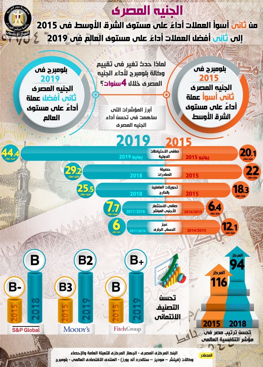 نشر المركز الإعلامي انفوجرافًا سلط من خلاله الضوء على أسباب تغير تقييم وكالة "بلومبرج" الاقتصادية الشهيرة لأداء الجنيه المصري خلال أربع سنوات من حيث تحسن أو تراجع سعر الصرف أمام الدولار الأمريكي، حيث سبق وأن صنفت الوكالة الجنيه المصري كثاني أسوأ عملة أداءً على مستوى الشرق الأوسط وذلك في عام 2015، لتقوم الوكالة نفسها بتغيير تقييمها في عام 2019 وتصنف الجنيه المصري كثاني أفضل عملة أداءً على مستوى العالم.