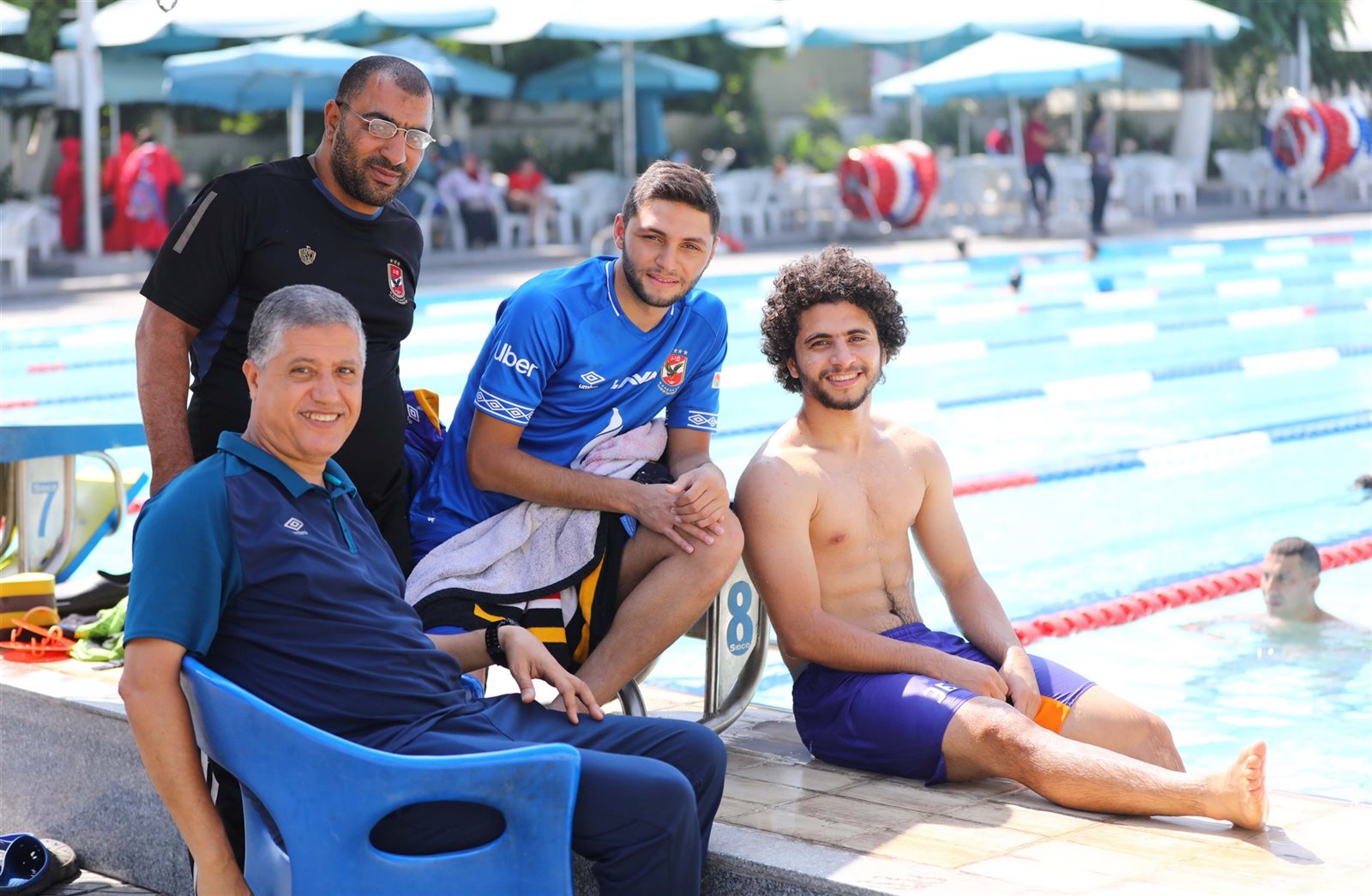 قام كريم نيدفيد ومحمد محمود لاعبا الفريق الأول لكرة القدم بالنادي الأهلي، بأداء تدريبات منفردة في حمام السباحة، في إطار البرنامج التأهيلي الخاص بهما لتقوية العضلات.