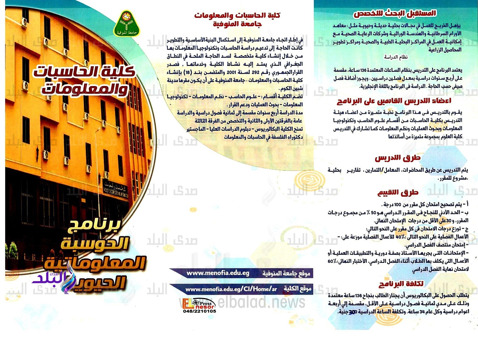 تقدم كلية الحاسبات والمعلومات برنامج الحوسبة المعلوماتية الحيوية لطلاب الثانوية العامة علمي رياضة وعلمي العلوم وما يعادل الثانوية العامة من شهادات أخرى والذي يقدم خريج كفئ له قدرة عالية علي المنافسة المحلية والعالمية من تصميم وتنفيذ ما يحتاجه البيولوجيين والأطباء من برامج حوسبة تستطيح تحليل ما هو متاح من بيانات بيولوجية للوصول لنتائج علمية مذهلة من فترات زمنية مقبولة وموارد تكنولوجية بسيطة في مجالات الحوسبة الحيوية والتنقيب داخل البيانات البيولوجية وتطوير الخوارزميات البيولوجية وتحليل نتائجها.
