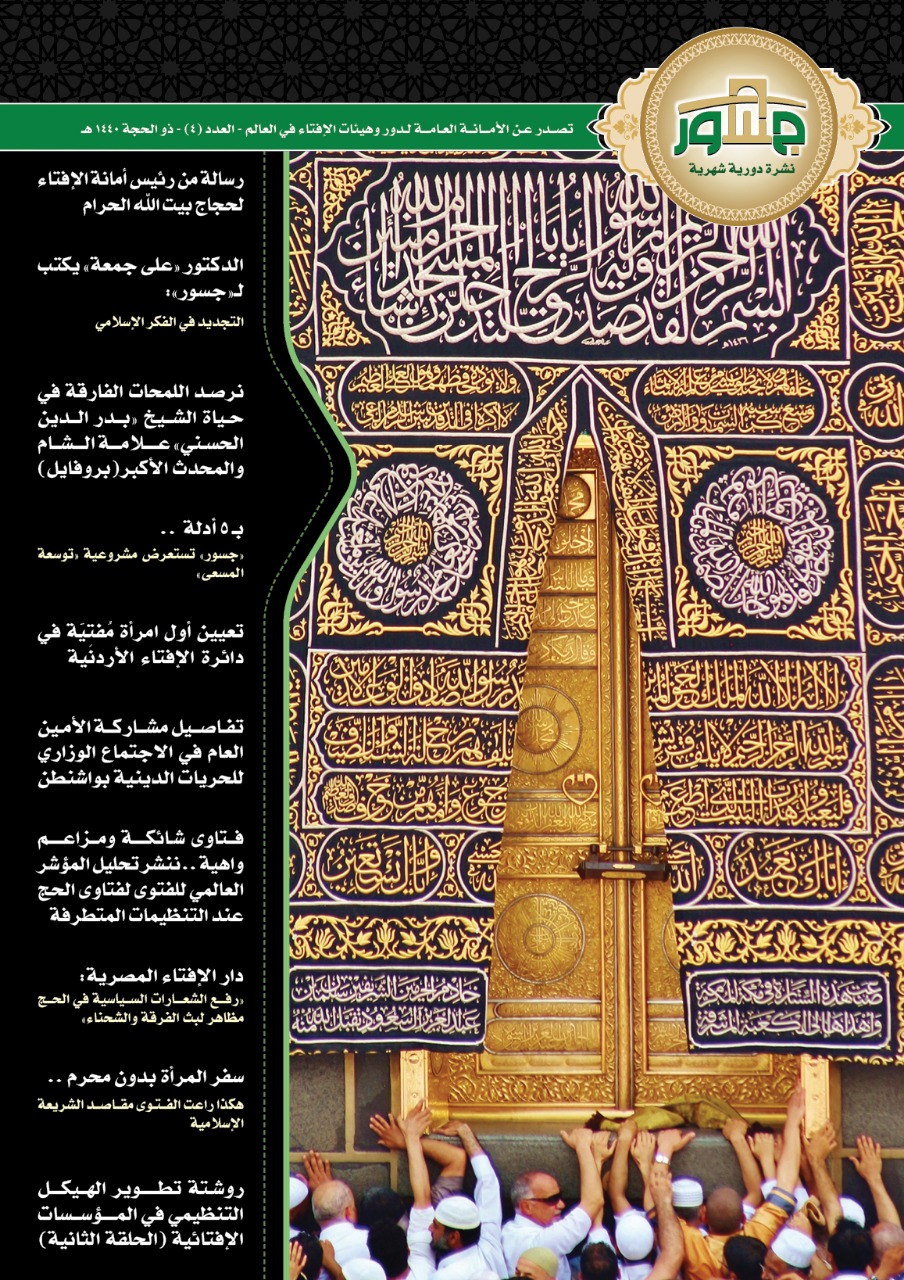 أصدرت الأمانة العامة لدور وهيئات الإفتاء في العالم، عددها الرابع من النشرة الشهرية الناطقة باسمها "جسور"، ويأتي هذا العدد متسقًا ومتزامنًا مع موسم الحج، وقد آثرت الأمانة أن يكون العدد شاملًا وافيًا لكل ما يتصل بهذا الركن الأعظم؛ حرصًا منها على أن تضع بين أيدي أعضاء الأمانة إصدارًا متميزًا من نشرتها، وذلك في إطار عنايتها بالتواصل الإعلامي مع كافة الدول الأعضاء.