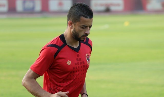 أدي باسم علي لاعب الفريق الأول لكرة القدم بالنادي الأهلي، تدريبات خفيفة بالكرة على هامش مران الفريق الجماعي مساء اليوم الخميس على ملعب التتش بالجزيرة.