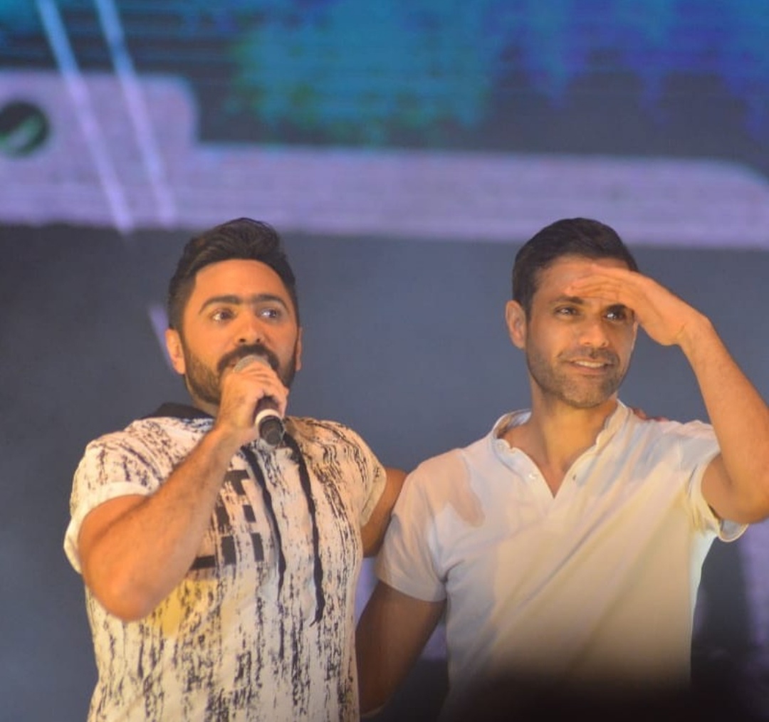 وظهر أمير طعيمة بالصورة مع تامر حسني بعد صعوده بجوار تامر واستقباله من قبل الجماهير.