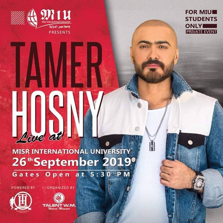 كشف الفنان تامر حسني عن موعد حفله المقبل المقرر اقامته يوم 26 سبتمبر بجامعة "مصر الدولية" ونشر صورة عبر صفحته الرسمية علي موقع التواصل الاجتماعي "فيس بوك" يروج فيها للحفل.