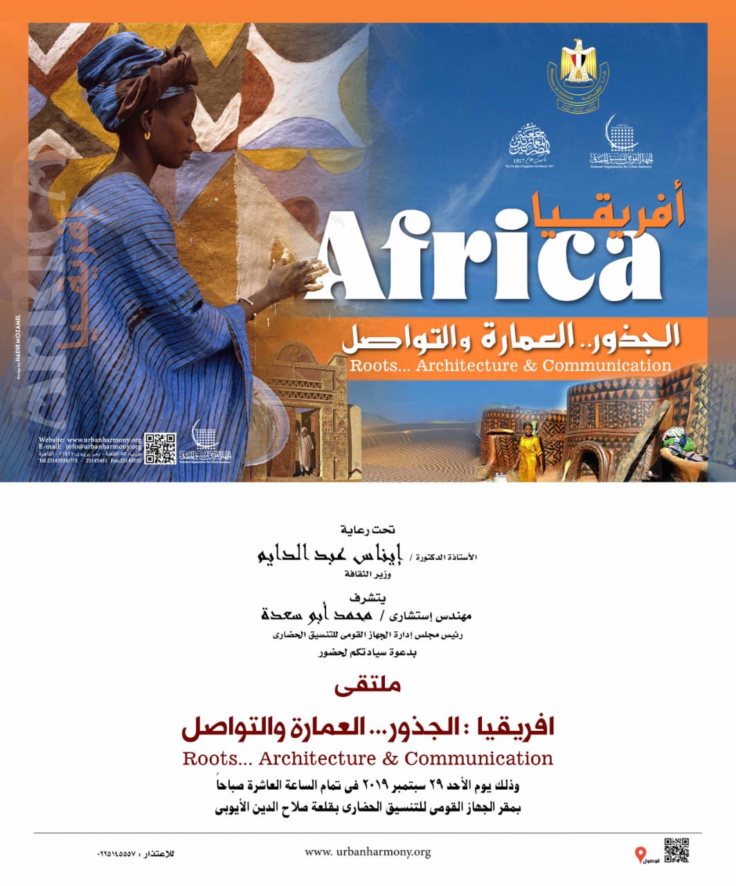 يقيم الجهاز القومي للتنسيق الحضاري برئاسة المهندس محمد ابو سعده ملتقى أفريقيا والذي يحمل عنوان: " افريقيا الجذور العمارة والتواصل" وذلك بالتعاون مع جمعية المعماريين المصريين ، والذي يقام صباح الاحد 29 سبتمبر 2019 بمقر الجهاز بقلعة صلاح الدين ، ويأتى هذا الملتقي على هامش رئاسة مصر للإتحاد الإفريقي.
