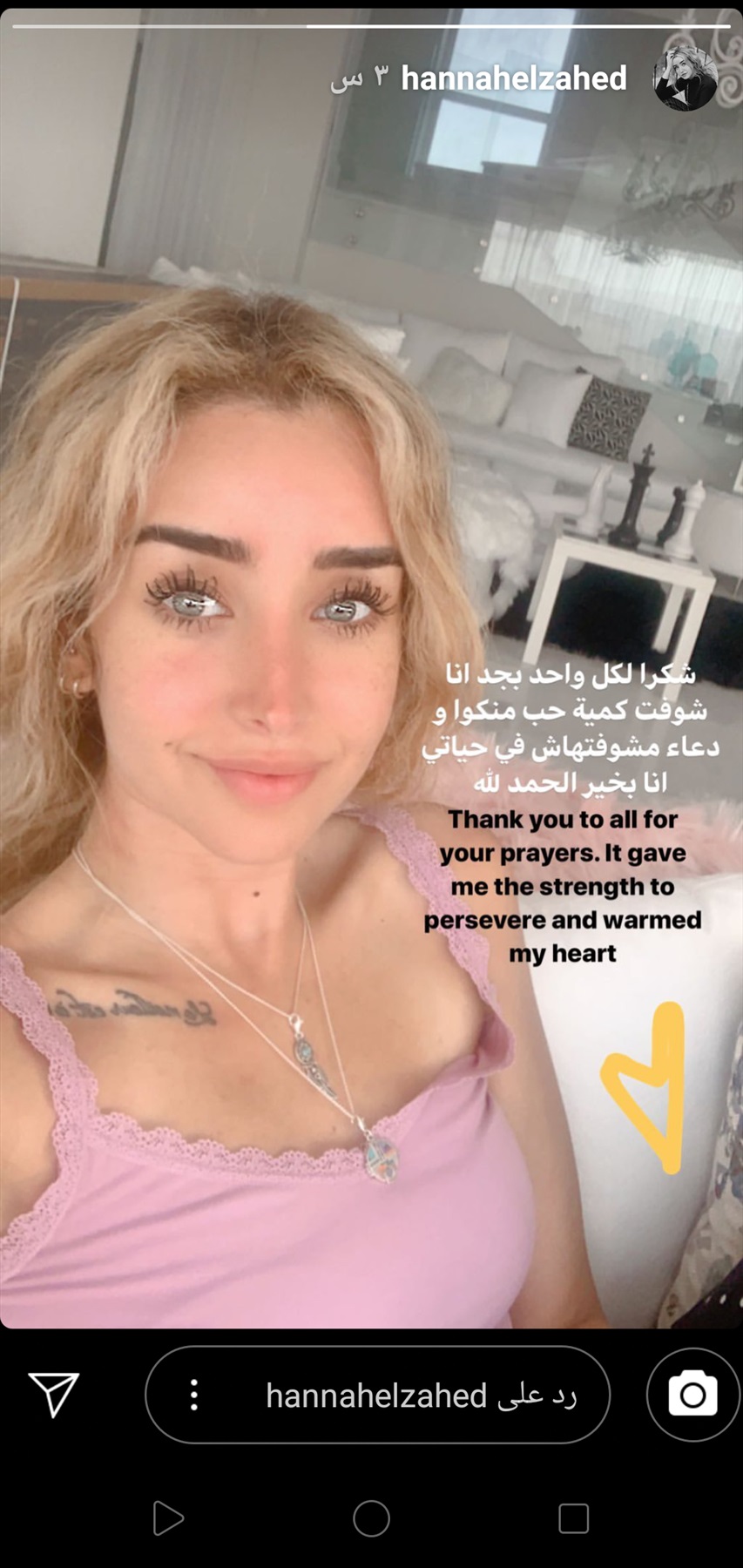 ونشرت هنا الزاهد، صورة عبر خاصية الإستورى بحسابها الشخصي بموقع الصور والفيديوهات "إنستجرام" علقت قائلة : "شكرا لكل واحد، بجد أنا شوفت كمية حب منكوا ودعاء مشوفتهاش في حياتي، أنا بخير الحمد الله".