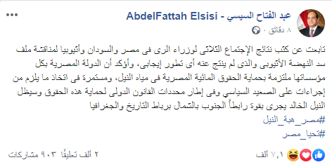وقالت إنه أضاف - خلال تدوينة على صفحته الرسمية على موقع التواصل الاجتماعي - "أؤكد أن الدولة المصرية بكل مؤسساتها ملتزمة بحماية الحقوق المائية المصرية في مياه النيل، ومستمرة في اتخاذ ما يلزم من إجراءات على الصعيد السياسي وفي إطار محددات القانون الدولي لحماية هذه الحقوق".