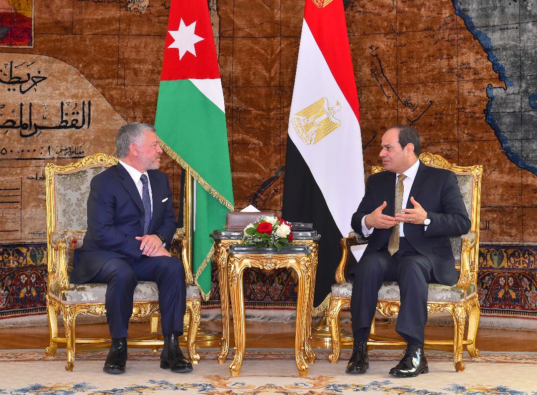 ومن جانبه، أكد العاهل الأردني اعتزاز بلاده بالعلاقات التاريخية والأخوية التي تجمع بين البلدين والشعبين الشقيقين، مشيدًا بالمستوى المتميز للعلاقات الثنائية بين مصر والأردن، ومعربًا عن الحرص على مواصلة توسيع التعاون في مختلف المجالات خصوصًا الاقتصادية والتجارية والاستثمارية، وكذا مواصلة التنسيق والتشاور إزاء مختلف القضايا ذات الاهتمام المشترك، بما يحقق مصالح البلدين ويعزز العمل العربي المشترك.