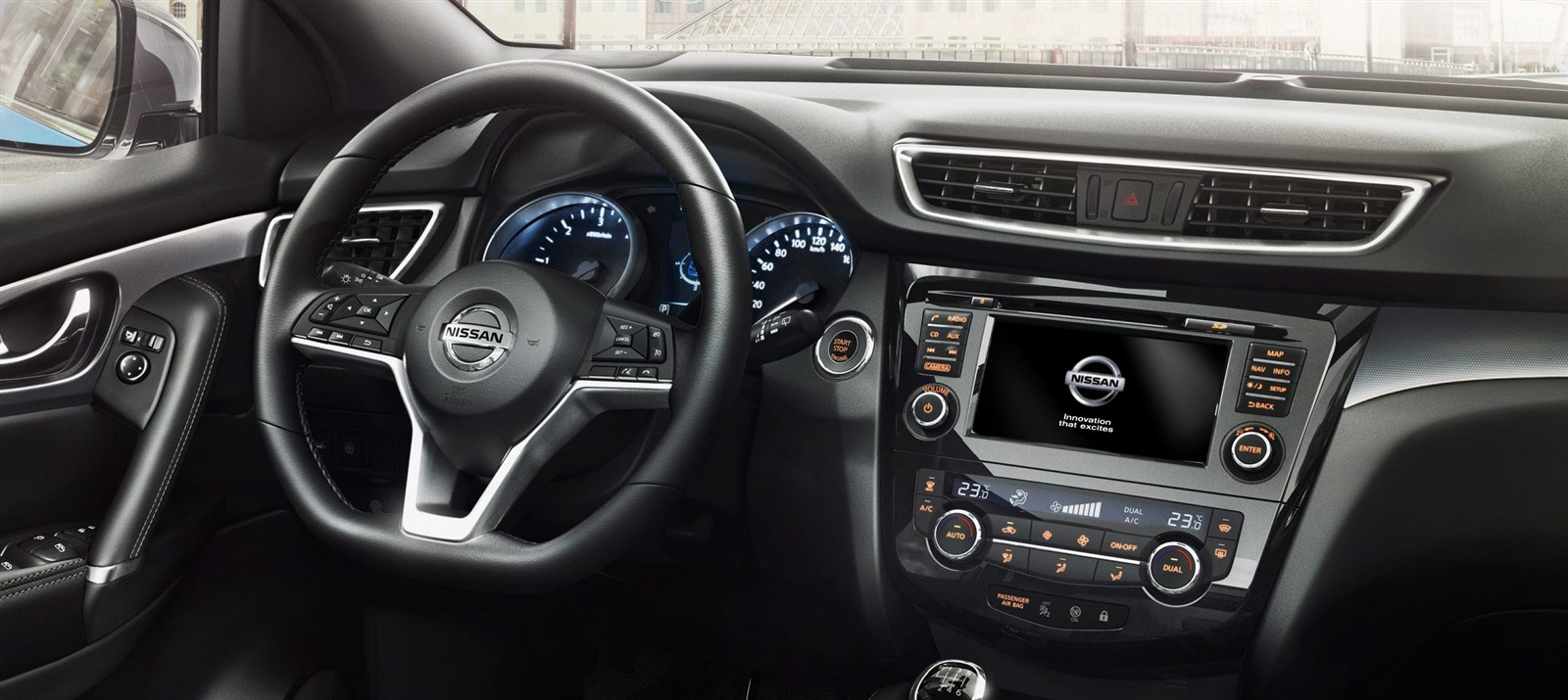 وتتوفر نيسان قاشقاي في ثلاث فئات، وتأتي أول فئة من السيارة نيسان قاشقاي بمفتاح ذكي لتشغيل وإيقاف السيارة، وخاصية مثبت السرعة Cruise Control ، وعجلة قيادة متعددة الوظائف تمنح السائق القدرة على التحكم في الصوت والبلوتوث وبيانات السيارة، ومرايات جانبية كهربائية قابلة للطي،ونظام صوتي يحتوي على راديو سي دي واربعة سماعات ومخرج USB وAUX هذا بالإضافة إلي وسائد هوائية للسائق و الراكب الأمامي .
