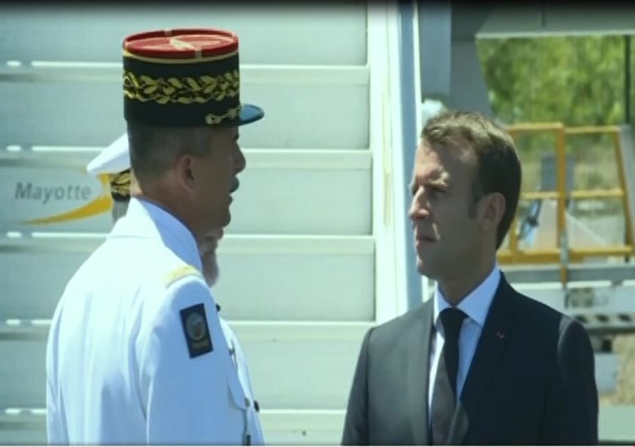 عرضت فضائية "إكسترا نيوز" لقطات من وصول الرئيس الفرنسي إيمانويل ماكرون إلى جزيرة مايوت.