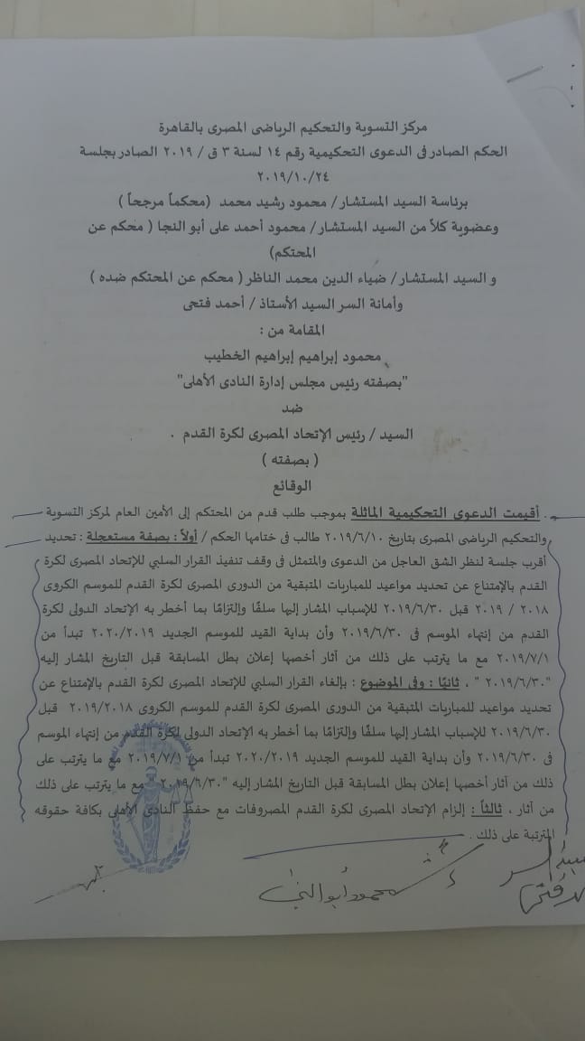 وأقام محمود الخطيب رئيس النادي دعوى أمام مركز التسوية والتحكيم المصري مطالبا بتصحيح المسار وإصدار ما يوجب إلزام اتحاد الكرة بتحقيق مبدأ تكافؤ الفرص والعدالة بين الاندية وانتظام جدول المسابقة دون تأجيلات أو تعديلات غير مبررة ، وأصدر مركز التسوية والتحكيم المصري الحكم المشار إليه .