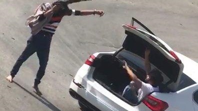 تداول نشطاء سعوديون على موقع التواصل الاجتماعي تويتر، اليوم السبت، مقطع فيديو يظهر قيام أحد الأشخاص باستخدام سلاح آلي "رشاش" في تهديد شخص آخر محتجز داخل شنطة سيارة بيضاء اللون من طراز كيا.