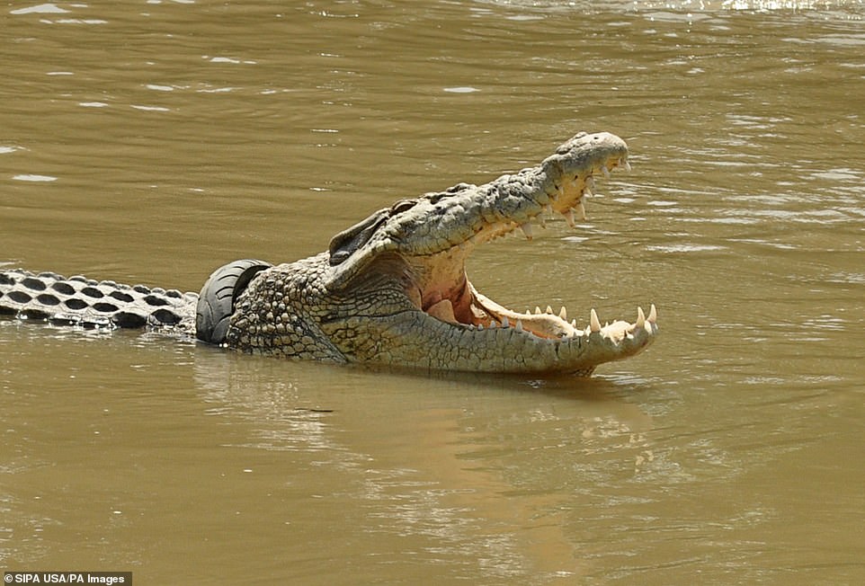 أجبر التمساح على حمل إطار دراجة نارية حول عنقه لمدة ثلاث سنوات، بعد أن حاول دعاة حماية البيئة في إندونيسيا تحريره من طوق الدراجة النارية الملازم لعنقه.