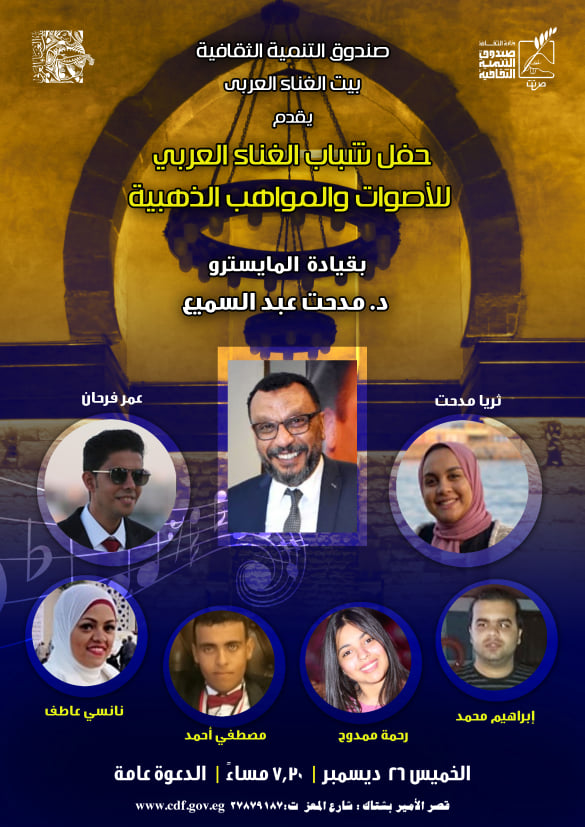 في إطار خطة صندوق التنمية الثقافية في دمج أصحابالهمم، يقيم "بيت الغناء العربي" بقصر الأمير بشتاك – بشارع المعز – التابع للصندوق في السابعة والنصف مساء الخميس 26 ديسمبر حفل يجمع بين مجموعة من الأصوات الفائزة فى مسابقتي "الصوت الذهبي" و"المواهب الذهبية لذوي الاحتياجات الخاصة" والذي نظمهما الصندوق خلال الدورات السابقة.
