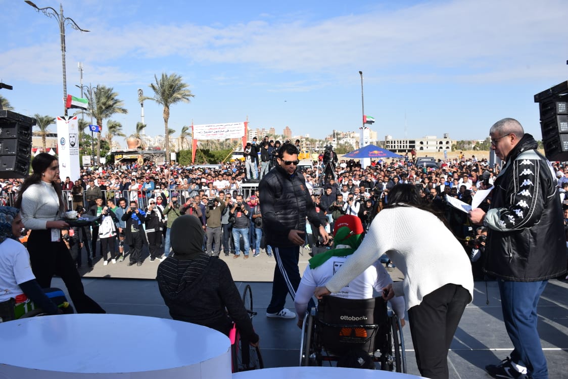 سلم الدكتور أشرف صبحي وزير الشباب والرياضة جوائز ماراثون زايد الخيري على الفائزين بالمراكز الأولى بالماراثون بحضور اللواء عبد المجيد صقر محافظ السويس، والسفير جمعة مبارك الجنيبي سفير الإمارات بمصر، والفريق محمد هلال الكعبي رئيس اللجنة العليا المنظمة لماراثون زايد، وعارف العواني امين عام مجلس ابو ظبي الرياضي، وطلال الشنقيطي أمين عام اللجنة الأولمبيةالوطنية بالإمارات.