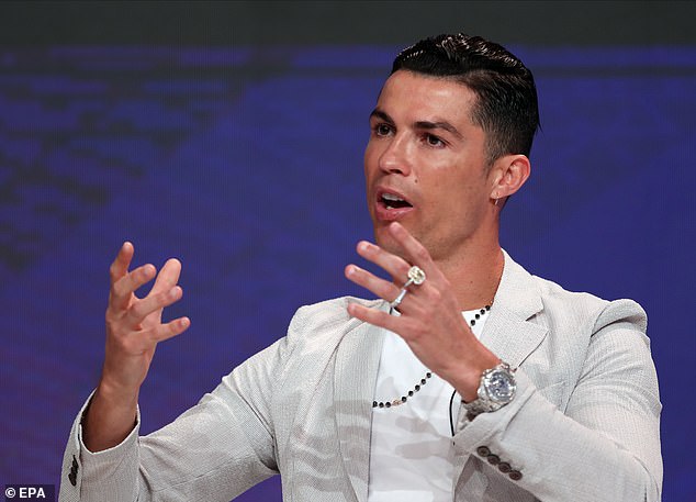 شوهد كريستيانو رونالدو وهو يرتدي خاتما ماسيا مبهرا في مؤتمر رياضي في دبي يوم السبت، وساعة رولكس نادرة ، وقُدّر الخاتم بنحو 200 ألف جنيه إسترليني.
