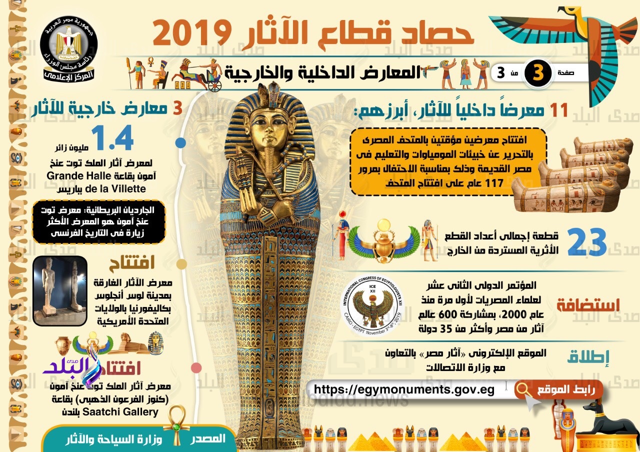 وعلى المستوى الخارجي، أوضح الإنفوجراف، أنه تم افتتاح 3 معارض أثرية خارجية، أهمها، افتتاح معرض آثار الملك "توت عنخ آمون" في باريس بقاعة (Grande Hall De La Villette) والذي بلغ عدد زائريه نحو 1.4 مليون زائر، وهو ما جعل مجلة الجارديان البريطانية تشيد بالمعرض وتؤكد أنه الأكثر زيارة في التاريخ الفرنسي.